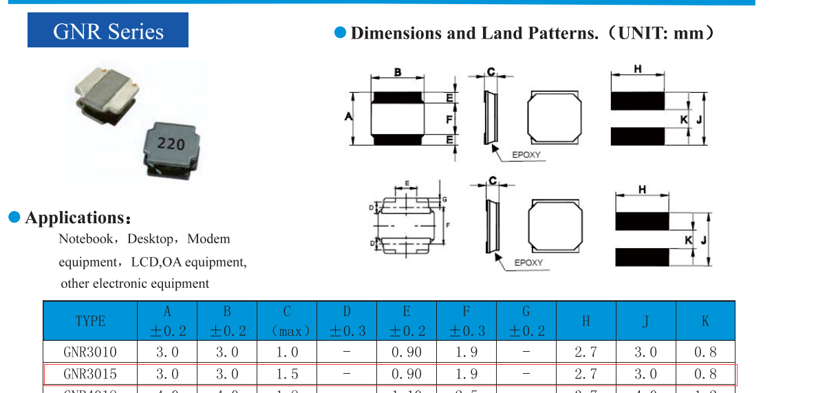 GNR3015NT1R0貼片電感電氣參數(shù):