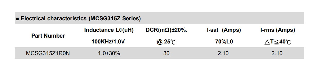 MCSG315Z1R0N貼片電感電氣參數(shù):